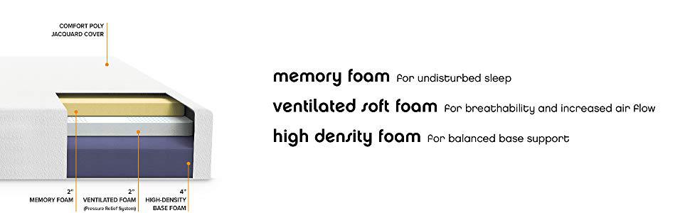 The 2″ Memory Foam on top provides good spine support while sleeping. The memory foam can take the shape of the body contours and prevents the build-up of pressure points. This is achieved by using the heat and the pressure of the body to conform to your exact shape. In other words, it allows you to sink into the mattress. The moment you get up from the mattress, it returns to its original shape. This provides a comfortable sleep and proper support for your body. Below this layer is the 2″ layer of Pressure relief Foam which reduces the pressure on the body using the ventilated soft foam to provide airflow and greater breathability. At the bottom, you have the 4″ supportive layer for providing balanced support to the body. This supports the entire structure of the mattress and helps to maintain the shape for a long time.
